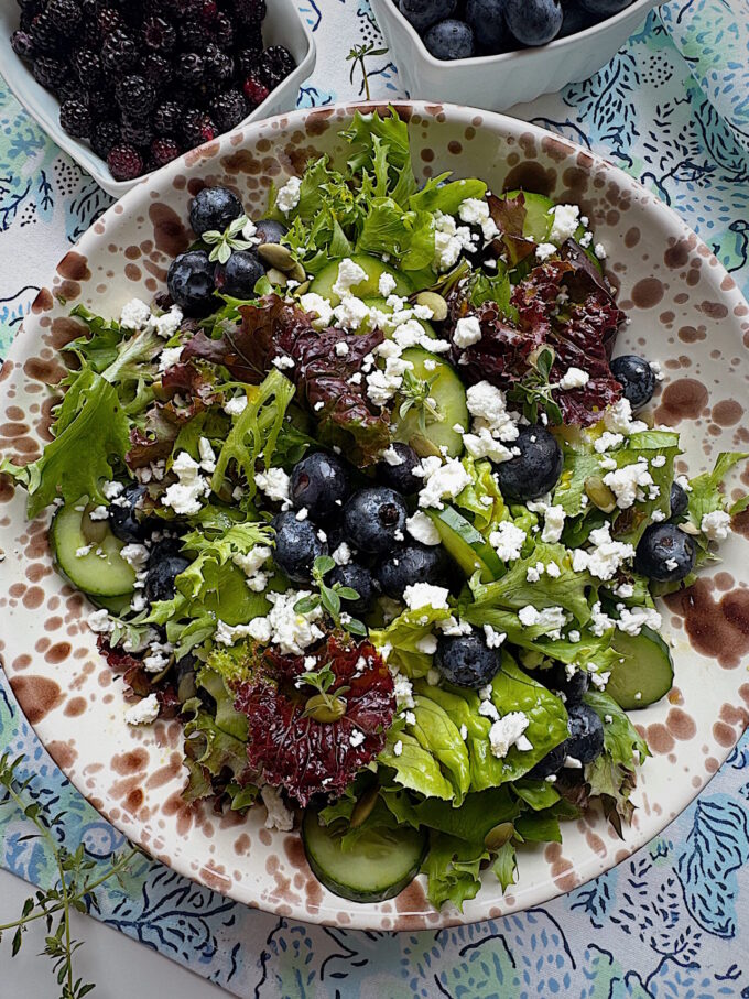 Make the salad: In a large bowl, toss together the greens, cucumbers, blueberries, cheese, and pumpkin seeds. Pour the dressing over the salad, and toss to coat.