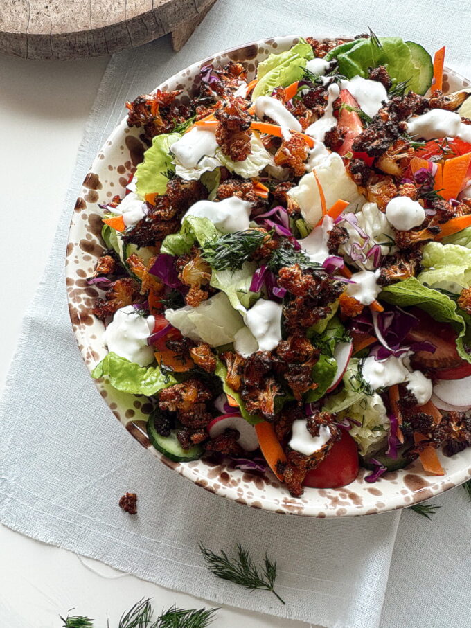 This is the salad I make when I want a salad – but want to feel full, too. It’s so satisfying (and filling!) because it’s loaded with different flavors and textures. One of the things I do to boost the flavor here is “layer” my dressings. I start by tossing the salad base with a simple vinaigrette made from apple cider vinegar, lemon juice, raw honey, extra-virgin olive oil, and chopped fresh dill. I then top the base and Buffalo cauliflower with a generous drizzle of homemade blue cheese dressing. The combination really packs a punch!