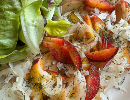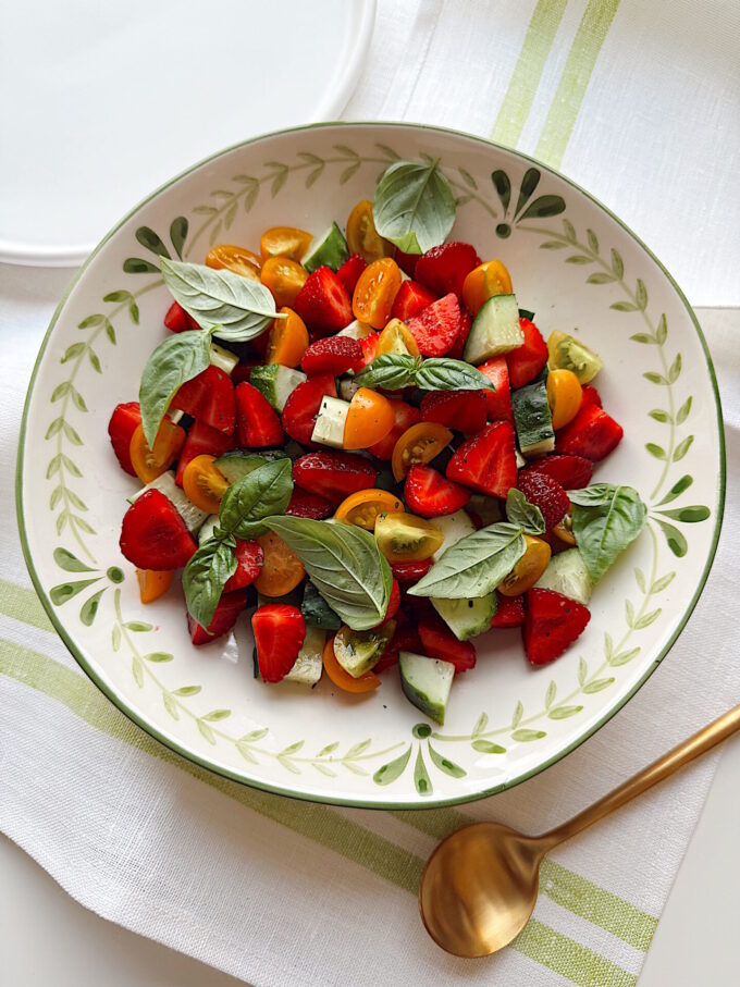 The “salad” you see here is a prime example of the above. I was inspired by a recipe from another (longtime) favorite cookbook, Cook Beautiful, by Athena Calderone. My cucumbers, strawberries and tomatoes all came ripe and sweet, straight from the garden, so I pared down my version even more. Instead of making a dressing, I subbed a drizzle of Lindera Farms drinking vinegar, which hit similar honeyed and spiced notes.